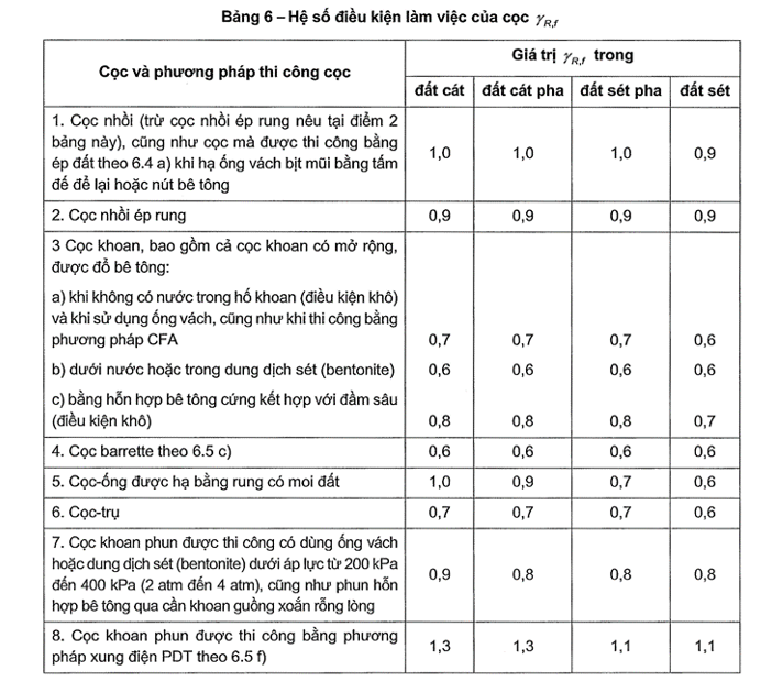 ĐIỂM KHÁC 1 – Các hệ số điều kiện làm việc ƳR,R (tùy vào mũi cọc mà có hệ số khác nhau), và ƳR,f tra bảng 6 thay vì bảng 4.