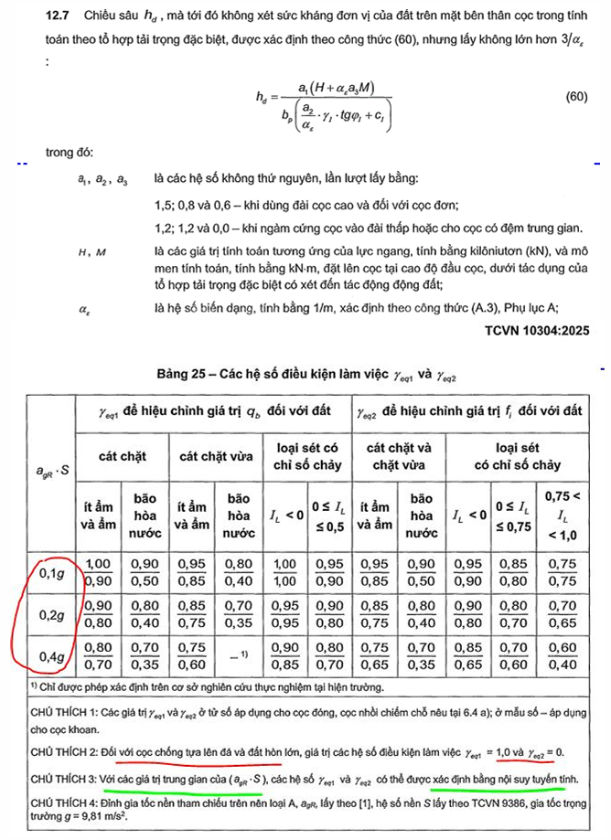 Quay lại chủ đề chuyên ngành của chúng ta, TCVN 10304:2025 đã phát hành hơn 03 tháng qua. Có những thứ thay đổi mang lại tín hiệu đáng mừng, vì có sự chỉ dẫn tính toán cụ thể hơn. Như phần xét động đất ảnh hưởng đến SCT của cọc trong mục 12 trong tiêu chuẩn.
